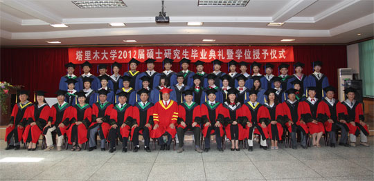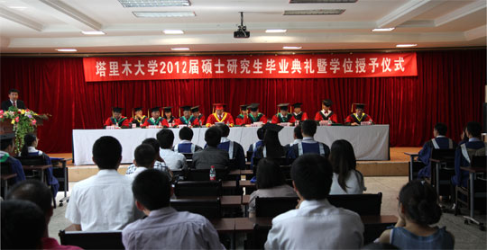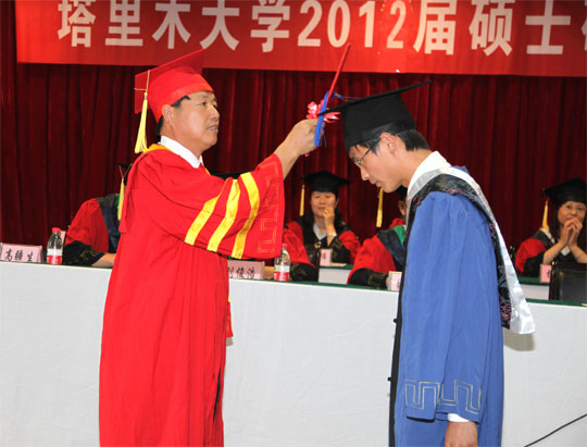 619下午,我校2012届硕士研究生毕业典礼暨学位授予仪式在南疆干部培训中心三楼会议室隆重举行。出席仪式的有校党委书记王选东,校长王合理,副校长依明•阿不利孜、马春晖、刘俊浩以及各学位点导师代表和全体研究生。毕业典礼暨学位授予仪式由研究生处处长石长青主持。