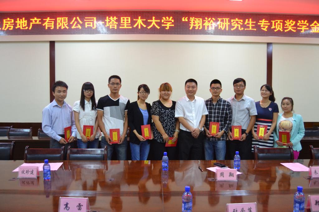 仪式上,校党委常委、副校长张爱萍介绍了我校的发展史以及我校在新疆,特别是南疆的重要作用及意义,并代表校党委向江苏涟水海上房地产有限公司对我校研究生培养工作的支持表示感谢。江苏涟水海上房地产有限公司董事长周翔对在我校设立研究生奖学金的缘由做了简要介绍,对我校的师生的胡杨精神表示敬佩,并表示以后还会常来,而且会联系江苏的其他的企业家来我校设立奖学金,鼓励研究生发扬胡杨精神,为祖国的边疆建设贡献自己的一份力。随后,双方领导签署了“翔裕研究生专项奖学金”协议并对2013-2014年度获得“翔裕研究生专项奖学金”的研究生进行了颁奖。