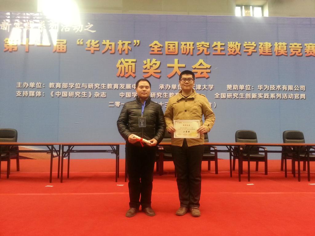 2014 1213 ,第十一届“华为杯”全国研究生数学建模竞赛颁奖大会在天津大学隆重举行。应全国研究生数学建模组织委员会邀请,我校数学建模指导教师代表康顺光老师和获奖研究生代表孙金龙同学参加了此次颁奖大会。我校今年首次参赛,选派的三支代表队全部获奖,其中全国二等奖两项,全国三等奖一项,总体成绩位居新疆高校前列。
