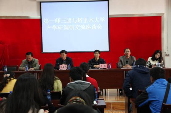 11月1日在3团会议室召开了“第一师3团与塔里木大学产学研交流座谈会”。全体研究生及导师参加了会议,会议由3团团长宋全伟主持,马琼副院长首先交流了此次调研的目地、要求,并介绍了学院总体情况。3团宋全伟从城镇建设、农业机械调整及设施农业、创业园建设等三个方面介绍了3团的基本情况。