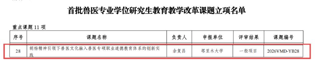 近日,全国兽医专业学位研究生教育指导委员会(以下简称“兽医教指委”)印发《关于首批兽医专业学位研究生教育教学改革课题立项的通知》,我校动物科学与技术学院余复昌教师申报的《胡杨精神引领下兽医文化融入兽医专硕职业道德教育体系的创新实践》课题成功获批立项。