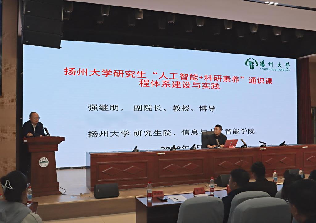 为深入贯彻落实教育部等五部门联合印发的《人工智能+教育行动计划》部署要求,主动顺应智能时代教育变革趋势,破解“人工智能+”课程建设中的重点难点问题,搭建教师教学交流与能力提升平台,4月17日,由研究生处主办的胡杨博学观澜讲坛第一讲在外语楼114报告厅顺利开讲。本次讲座特邀扬州大学卓越工程师学院副院长强继朋教授担任主讲嘉宾,围绕研究生“人工智能+”课程体系建设开展专题分享,分管研究生工作的院领导、相关学科教师齐聚一堂,共探智能时代研究生教育高质量发展新路径。