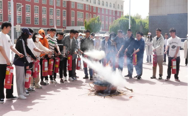 消防救援大队消防员蔡进平向同学讲解了火灾逃生时的注意事项,并现场教学如何正确使用灭火器。在消防员的指导下,学生上前进行了实操灭火训练。